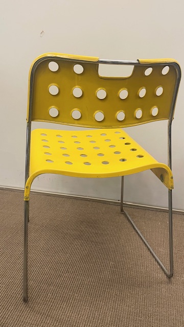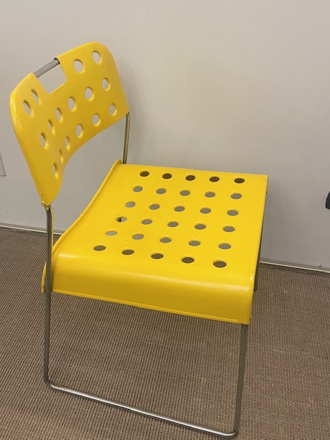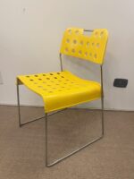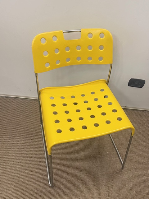 Gruppo di quattro sediein metallo cromo e smaltato giallo denominate Omkstak di Rodney Kinsman prodotte da Bieffeplast Padova nel 1970